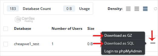 3. Under database text, you can see a list of your databases. On your database, you will see a plus (+) icon, displayed on the right side. Click on it and select Download as SQL or GZ.