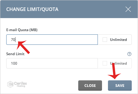 5. Modify the E-mail Quota field as per your requirement. If you have the unlimited option available, choose Unlimited instead.
