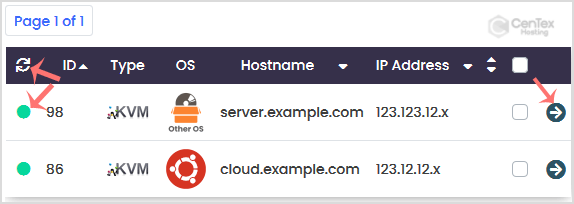 3. Under the refresh icon, you can see a green or red circle in front of each VPS. If it is displays a green circle, it will mean that your VPS is online.