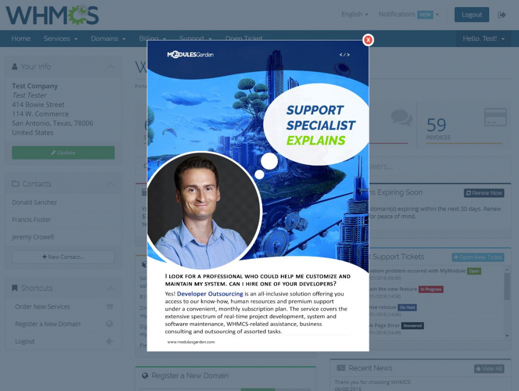 This module can help its users in miraculous ways. The user can customize when the pop up will appear on the screen of the clients it can appear on particular days or any other condition such as if the customer stays for a long time on the website and so on. The pop-ups will be visible across your client area.