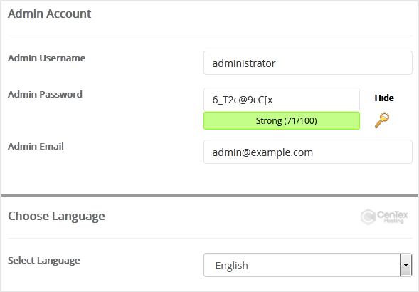 - Admin Username: Your new Microweber username (for security reason do not use the Administrator or the Admin username.)