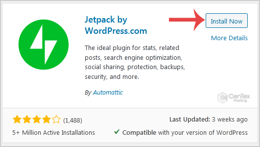 4. The available plugins matching the keyword Jetpack will appear. Click on the Install button, which appears next to the plugins name.