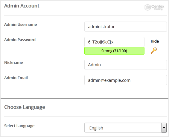 - Admin Username: Your new PivotX username (for security reason do not use the Administrator or the Admin username.)