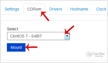 4. Now click on the CDRom tab, and if the CD-ROM is already mounted, click on unmount and then select your operating system from the list. Then click on Mount.