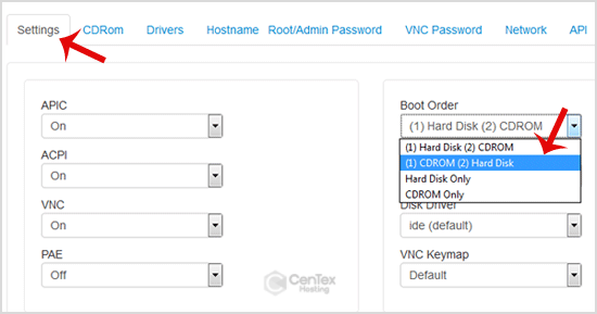 3. Scroll down, and under the settings tab, change the Boot Order to (1) CDROM (2) Hard Disk.