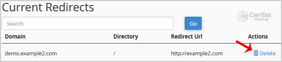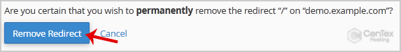 3. Scroll down to the end of the page and under Current Redirects locate the domain and click on the remove icon.